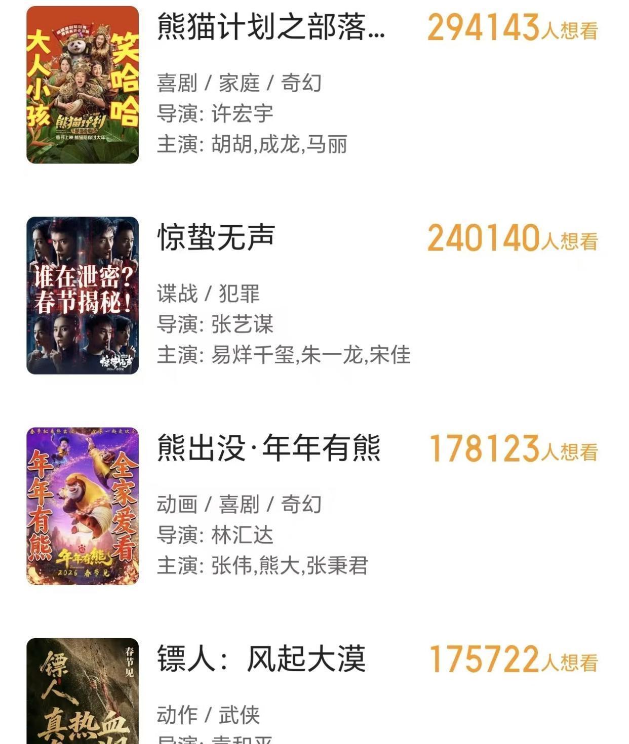 可另一边,《镖人》的情况就有点让人捏把汗了。这片子阵容豪华得吓人,连李连杰都出山了,按理说应该万众期待才对。谁能想到,它的想看数据居然被合家欢动画《熊出没之年年有熊》给反超了,在几部新片里垫了底。这事儿挺让人感慨的,曾经的功夫巨星,如今号召力似乎也扛不住市场的变化了。